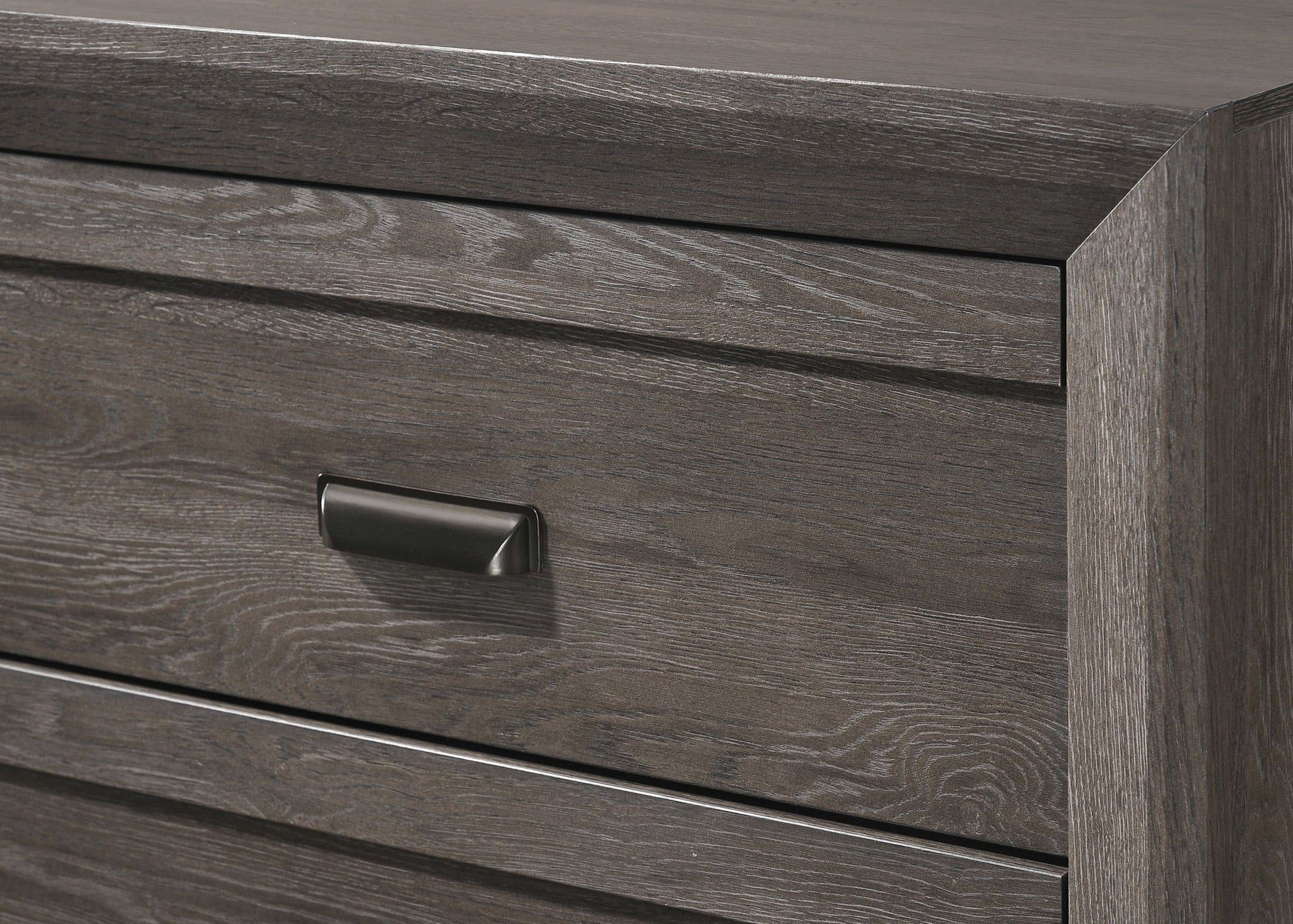 This bedroom set is the embodiment of understated sophistication, featuring a neutral finish that complements its clean and contemporary design. The robust bed frame anchors the room with a sense of sturdiness and style. Accompanying the bed are coordinating pieces: a dresser with a large mirror, a tall chest for additional storage, and a nightstand to keep essentials within reach. Each piece is crafted with sleek, straight lines and fitted with rectangular cup pulls, creating a cohesive look that’s both modern and timeless.