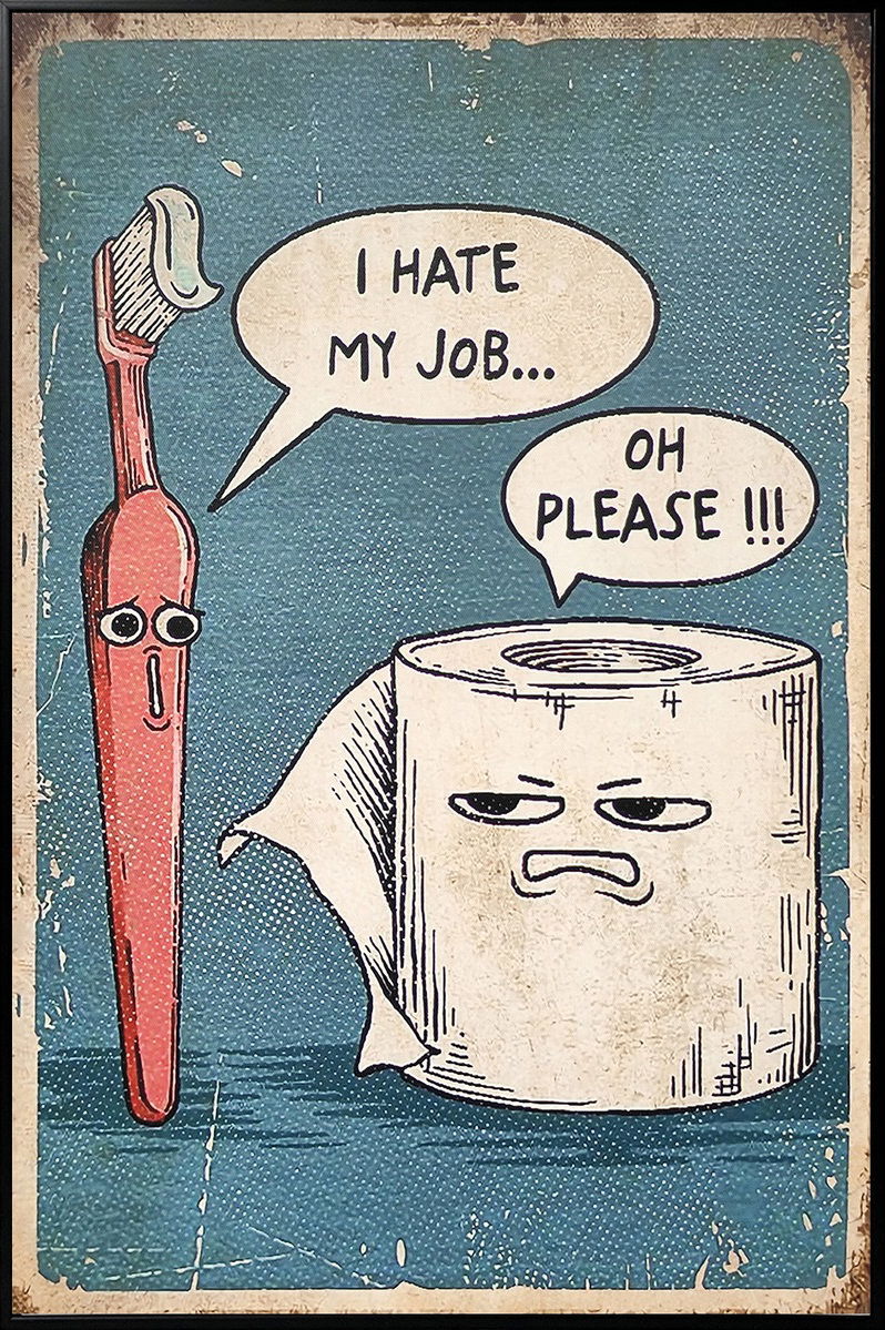Add a touch of humor to your space with this whimsical graphic art piece. Featuring a playful conversation between a toothbrush and a roll of toilet paper, it brings a light-hearted vibe to any room. Perfect for those who appreciate a good laugh and unique decor.