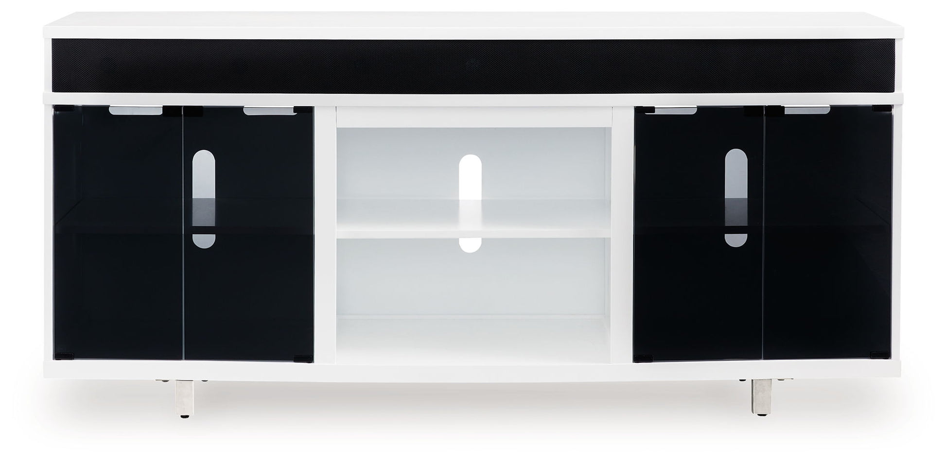 Combining a white high-gloss finish with black glass doors, this TV stand proves opposites really do attract. It's the perfect blend of modern style and functionality, with an electric fireplace option and ample space for your media devices, flat-screen TV and soundbar. What a smart choice on so many levels.