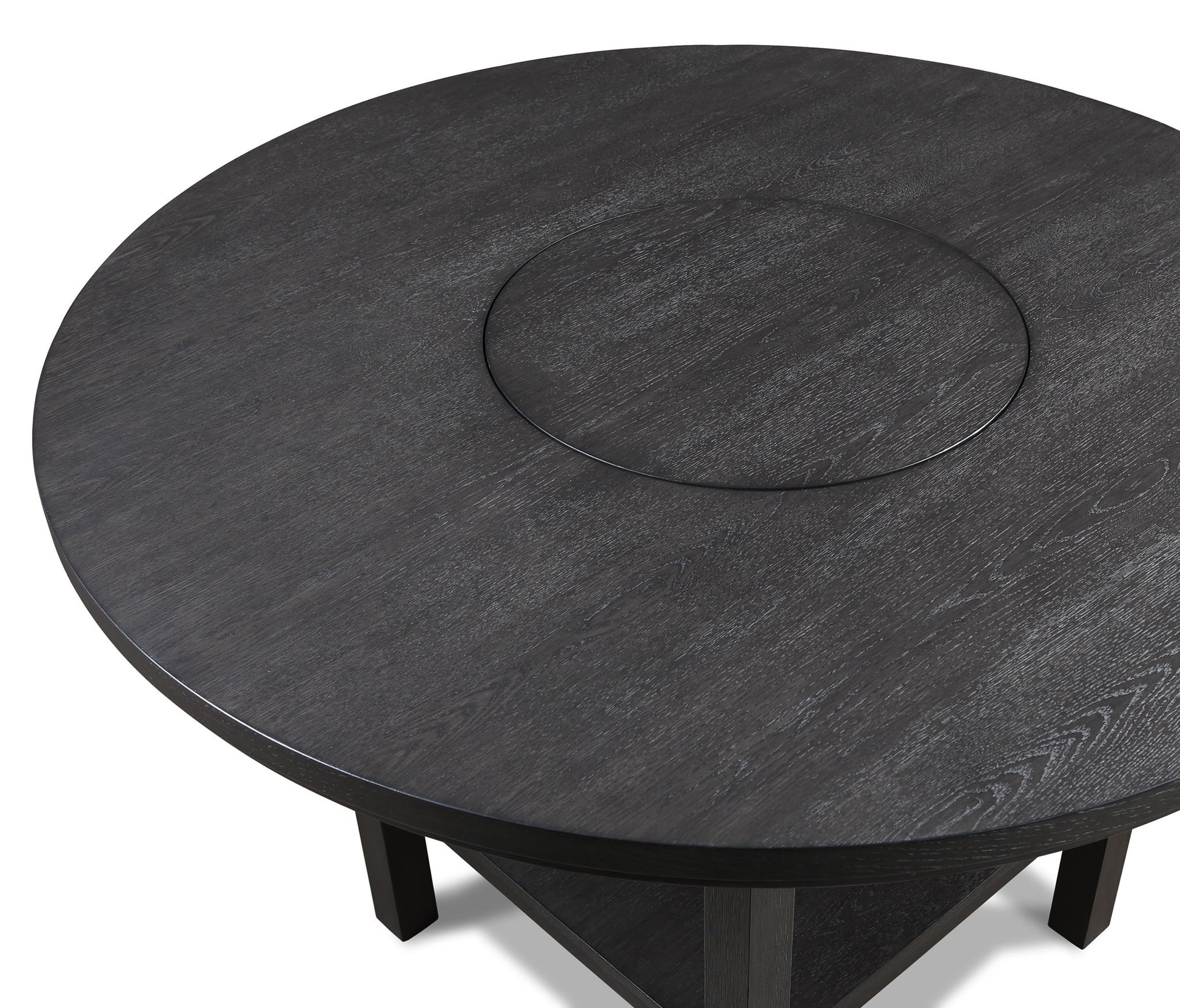 Elevate your dining experience with this contemporary dining group, where modern design meets rustic charm. Crafted with a rich, dark finish, the round table offers a built in turntable and an open shelf below. The subtle grain detailing on the table's surface adds depth and character. Complementing the table are the sleek, slat-back chairs, designed for comfort and style with their plush upholstered seats.