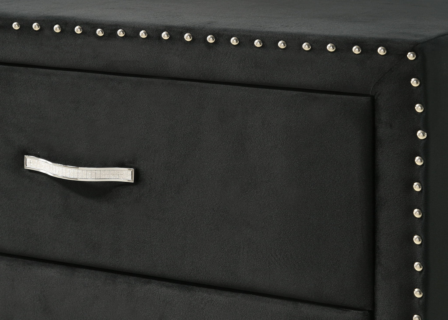 Immerse yourself in the regal charm of this majestic bedroom collection, a true embodiment of luxurious comfort and refined elegance. At the heart lies a bed that commands attention with its impressive wingback headboard, richly upholstered in a rich velvet and adorned with diamond tufting and shining nailhead trim, offering a sophisticated centerpiece. Accompanying the bed are matching pieces, each boasting the same sumptuous fabric and exquisite detailing. The nightstand and chest of drawers stand as stately companions, offering practical storage solutions without compromising on style, their sleek handles gleaming against the dark, plush fabric. The dresser, accompanied by a statement mirror framed with a hint of sparkle, completes the set, creating a harmonious balance between functional design and opulent aesthetics.
