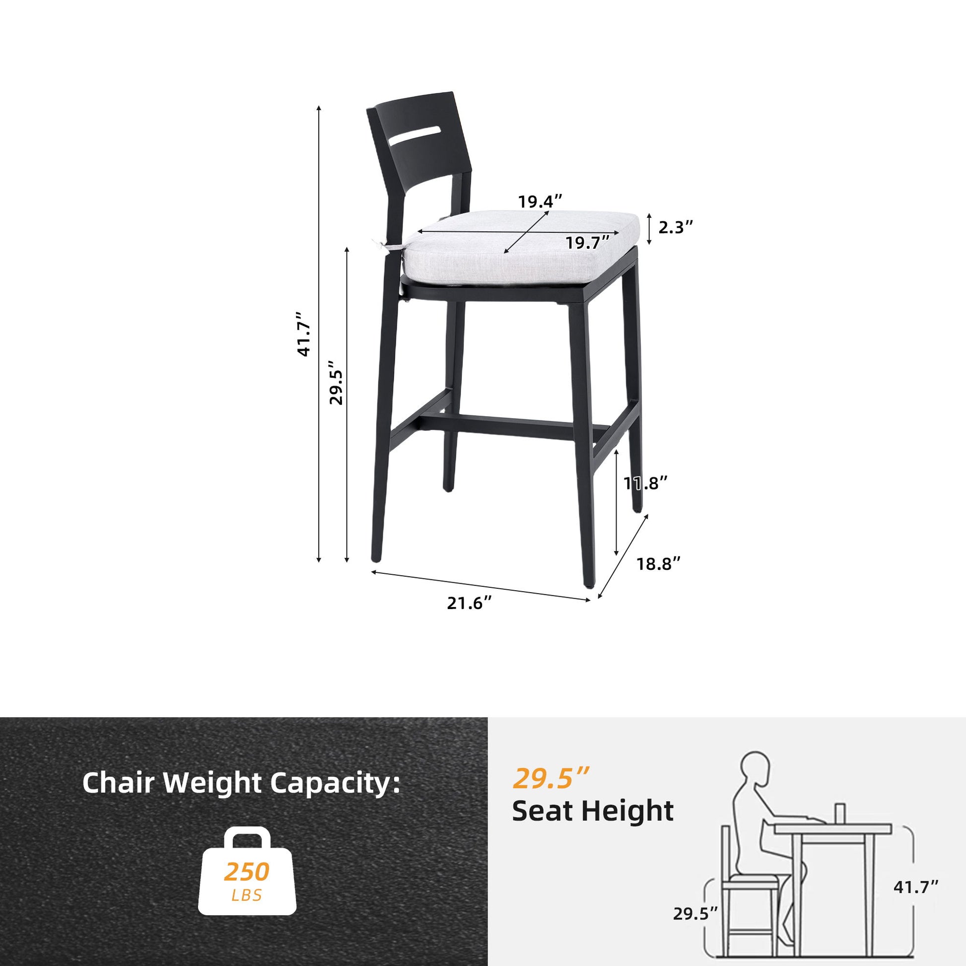 Outdoor Bar Stools, Patio Chairs With Backrest And Footrest, Weather Resistant, Sunbrella Cushions (Set of 2) - Ember Black