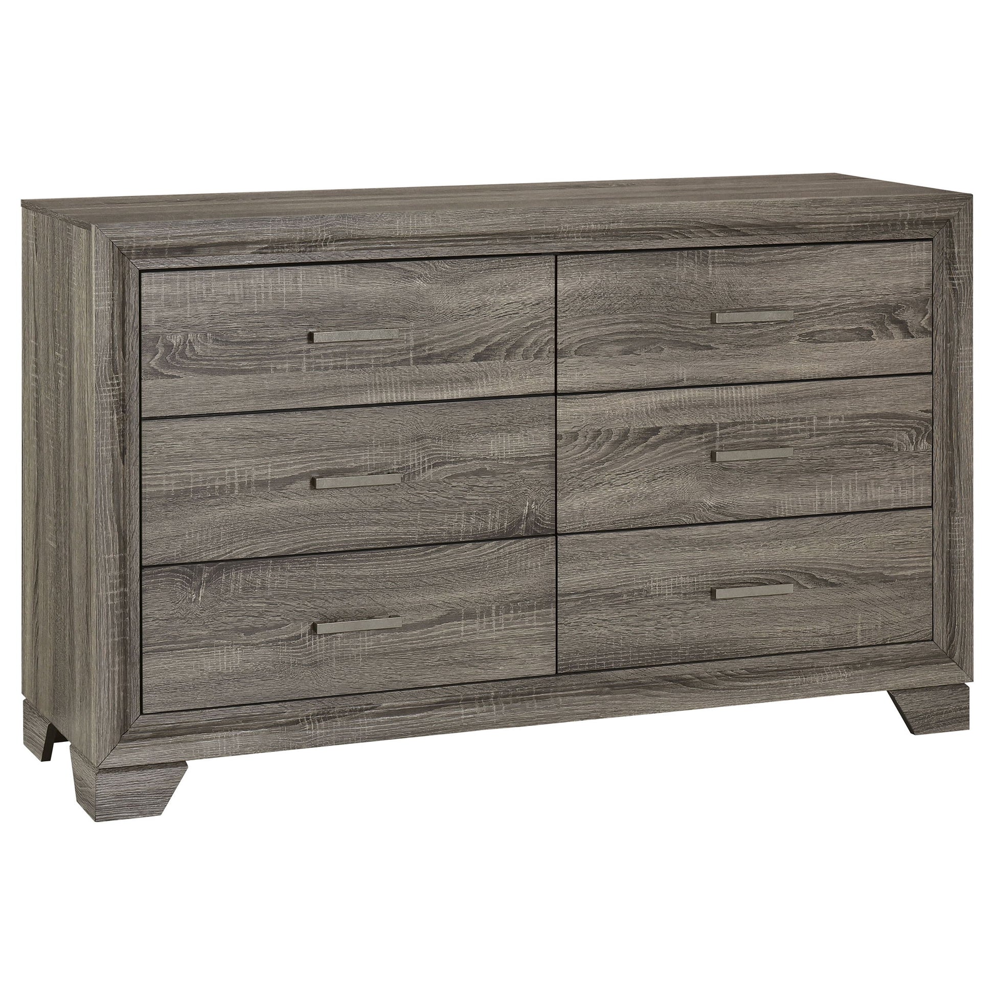 Introduce gracious style in an approachable, tailored bedroom suite with this transitional six-drawer dresser. Designed to augment clothing and accessory storage, it's built with six roomy drawers, all complete with center metal glides for smooth performance. Its exterior features engineered wood and laminate construction, creating durability and reliability. Its case is encased in mitered trim and stands on singular block legs, adding a sense of precision and character. Bar handles complete the stylish look while its wide top allows for a curated selection of decor brings a personal touch.